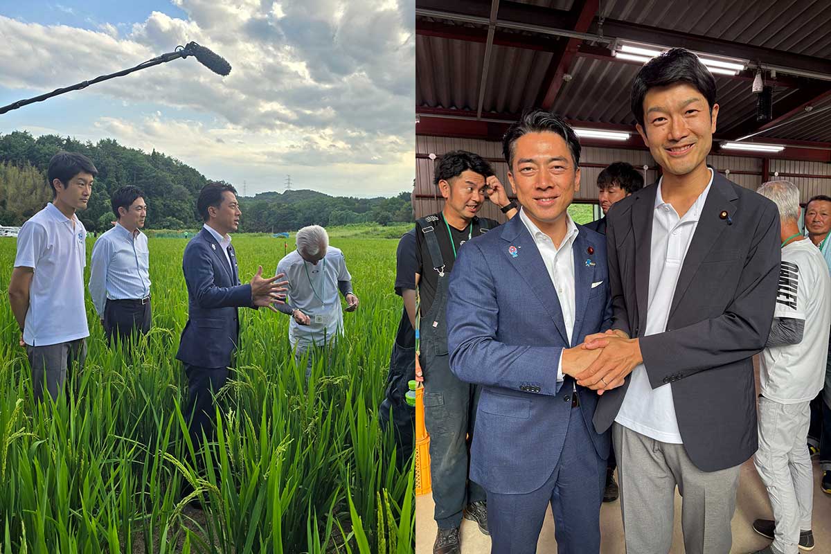 楪園芸さんは、耕作放棄地となっていた土地を再生させ、稲の種を直接播いて、その後は水も張らずに雨水だけで稲を育てます。それが信じられずに参加した私に、楪園芸の柏原さんが言った一言が、「拓さん、うちの田んぼは長靴じゃなくてサンダルで来てくれていいんだよ笑」。実際に農地に入ると、土はふかふかで、稲がすくすくと育っていてびっくりしました。その後の懇談会では、ここまでの技術を確立するまでのご苦労を伺いました。 一方で、進次郎大臣からは、「乾いた土地で稲を育てられると言っても真に受けてもらえない。